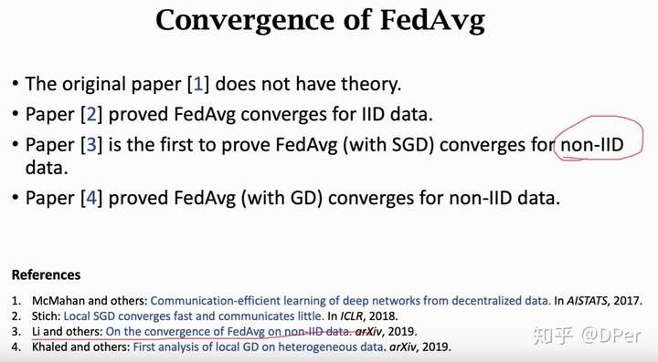 Federated Averaging算法首次由[1]提出,但是没有理论证明,论文[2]证明了Federated Averaging算法对于对同分布数据是收敛的,论文[3]首次证明了Federated Averaging算法对非独立同分布的数据也是收敛的,论文[4]和[3]得到了类似的结论,但是结果晚一点出来。