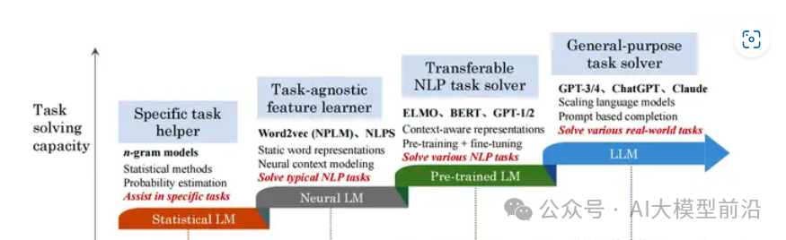 语言大模型作为此次热潮的引领者,通过大规模预训练学习大量语言知识与世界知识,具备面向多任务的通用求解能力。其发展经历了**统计语言模型、神经语言模型、预训练语言模型到语言大模型(探索阶段)**的四个阶段。