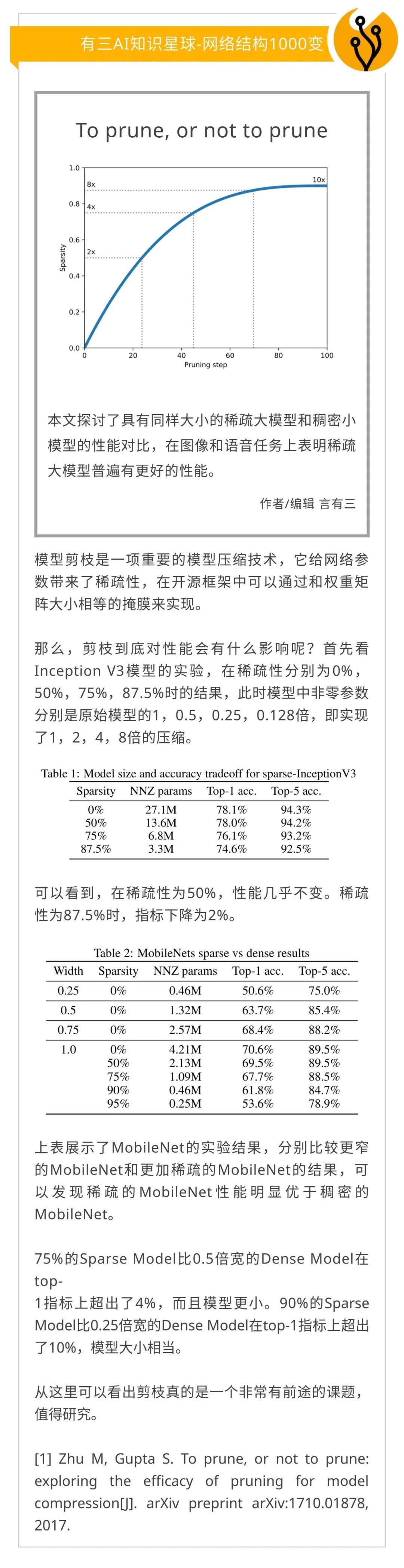 在真正研究模型剪枝之前,我们首先要知道为什么要做这件事,模型到底有多么冗余呢,以Google对大模型和移动端小模型的研究来说明这个问题,如下。