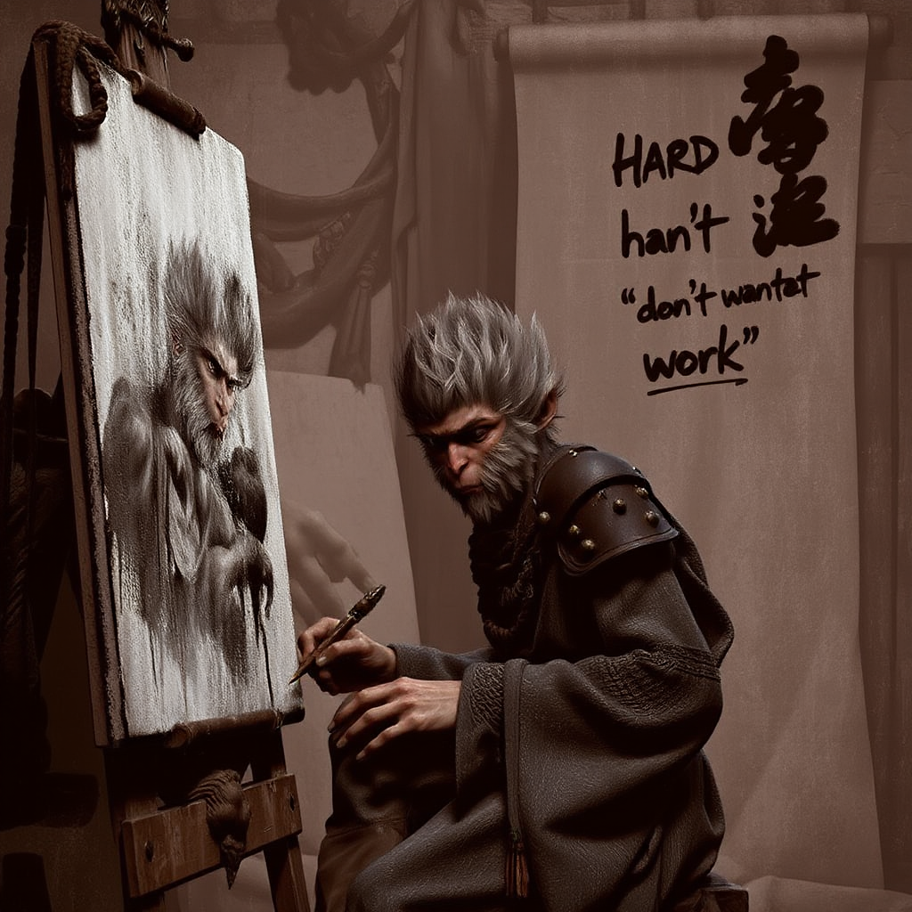 Wukong,in the painting studio,painting,sketching,using a paintbrush, writing,and working hard (big text says’ don’t want to work ')