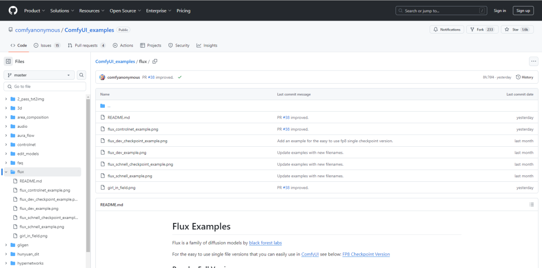 3、下载clip文件,进入comfyui的github主页找到flux:https://github.com/comfyanonymous/ComfyUI_examples/tree/master/flux