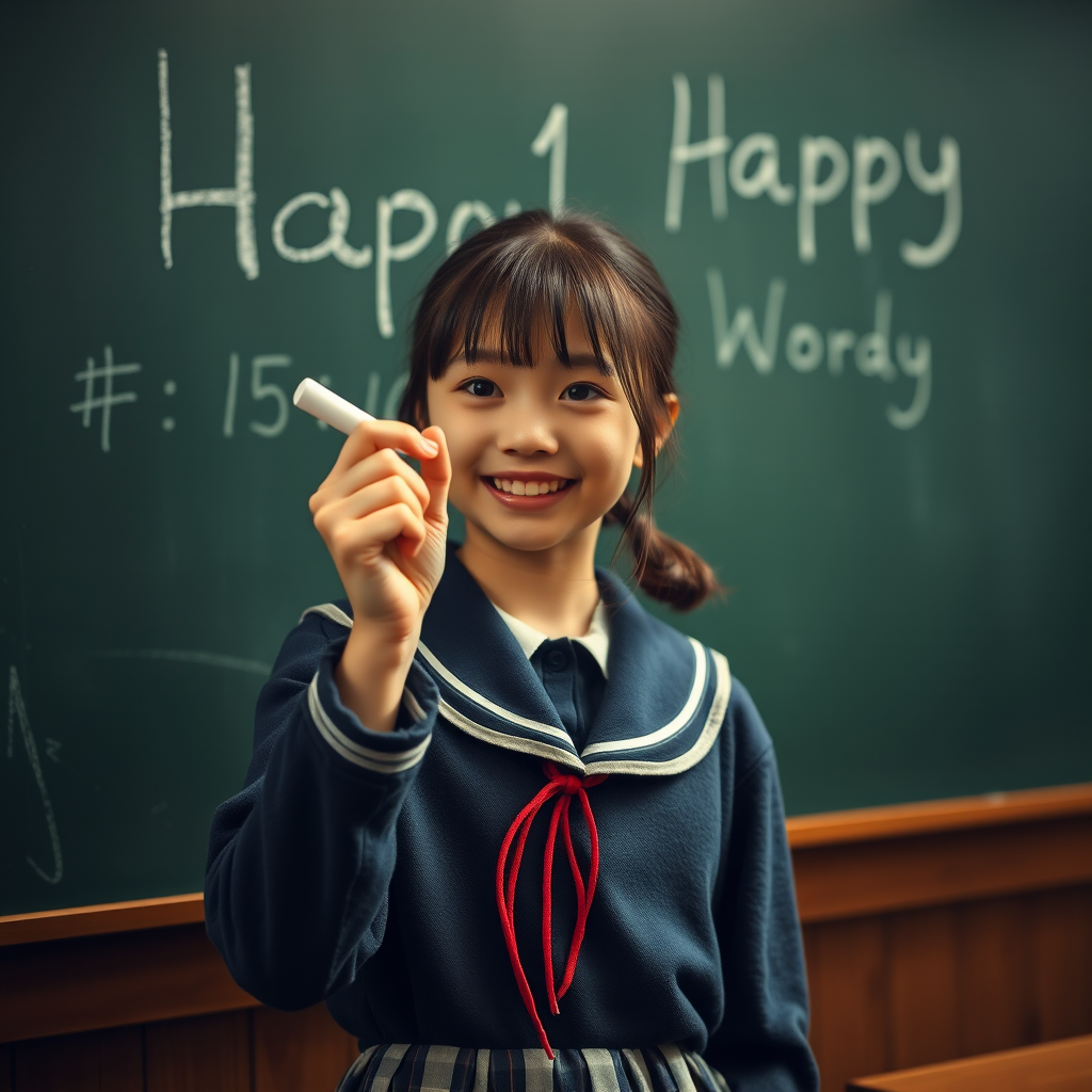 A girl wearing a school uniform, holding chalk to write happy words on the blackboard, real photography, school classroom, half body composition, movie lighting, rich details, Japanese low saturation