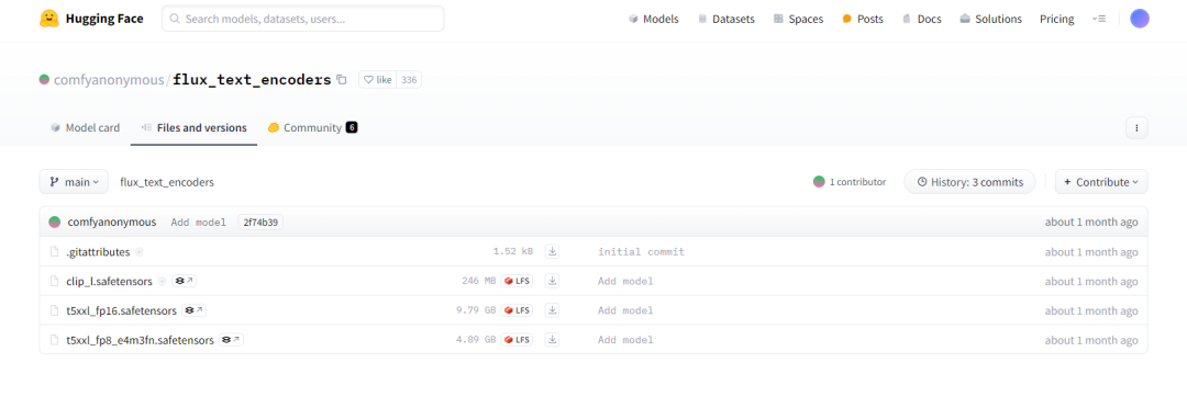 从这里进入,看到clip_l.safetensors、t5xxl_fp16.safetensors、t5xxl_fp8_e4m3fn.safetensors这三个文件下载。