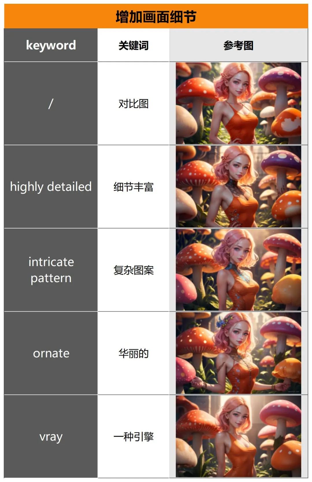 Highly detailed: 通过观察人物的衣服和背后的蘑菇等细节,可以明显看出与对比图相比,添加了这个关键词后,生成的图片会更具细节。