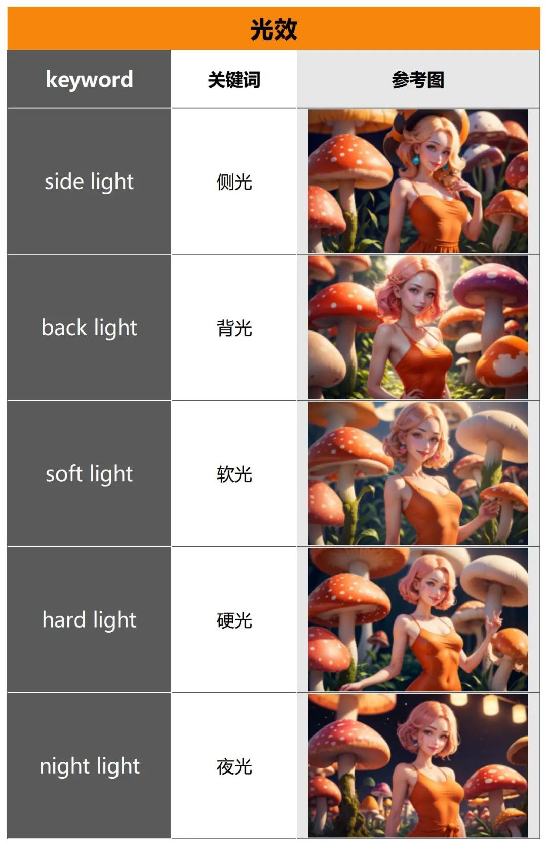 需要注意的是,有些光效关键词还可以用其他表达方式来表示。例如,“side light” 也可以表达为 “side