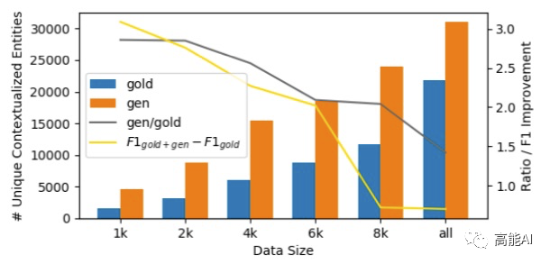 此外,DAGA会生成更丰富的实体上下文,论文以相同实体mention的1-gram作为评估指标进行了统计。如下图所示,桔色代表DAGA生成的实体上下文,比原始的训练集会有更丰富的上下文。