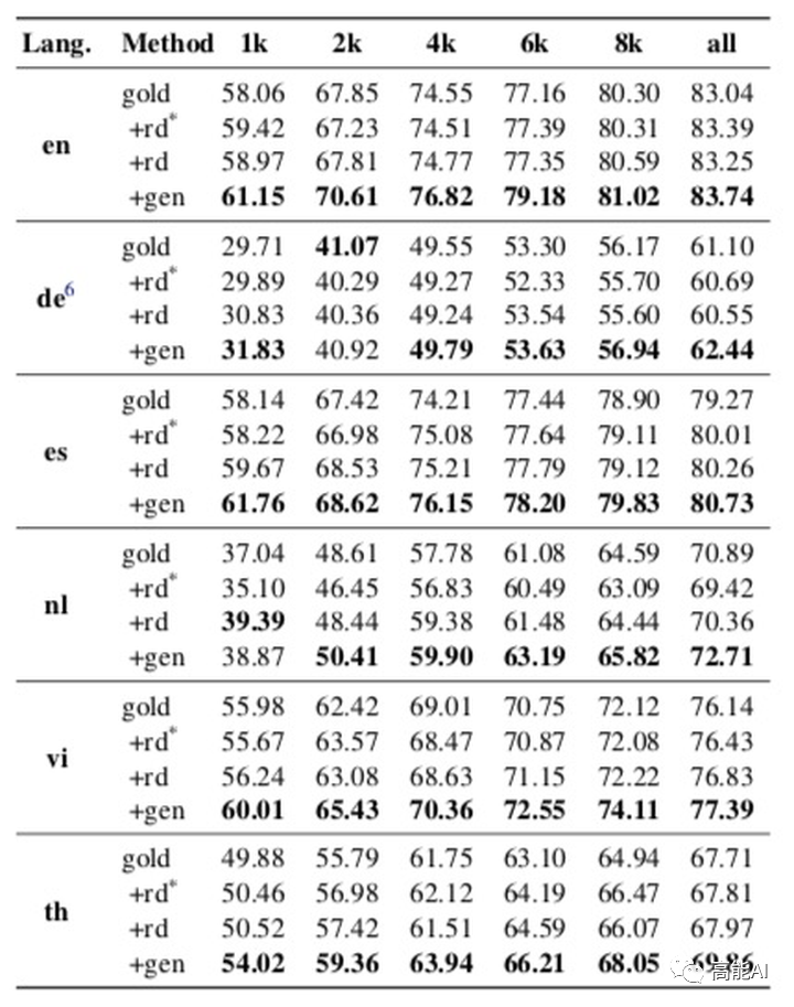 具体结果由上图展示(设置了6种不同语言数据、不同的原始标注数据量进行对比),可以看出:DAGA方式(gen)明显超过其他数据增强方法,特别是在低资源条件下(1k和2k数据量)。2.2 使用无标注语料进行语言生成共采用3种实验设置: