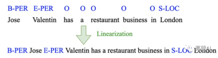 DAGA的核心思路也十分清晰,就是标签线性化:即将原始的「序列标注标签」与「句子token」进行混合,也就是变成「Tag-Word」的形式,如上图所示:将「B-PER」放置在「Jose」之前,将「E-PER」放置在「Valentin」之前;对于标签「O」则不与句子混合。标签线性化后就可以生成一个句子了,基于这个句子就可以进行「语言模型生成」训练啦~是不是超级简单?!