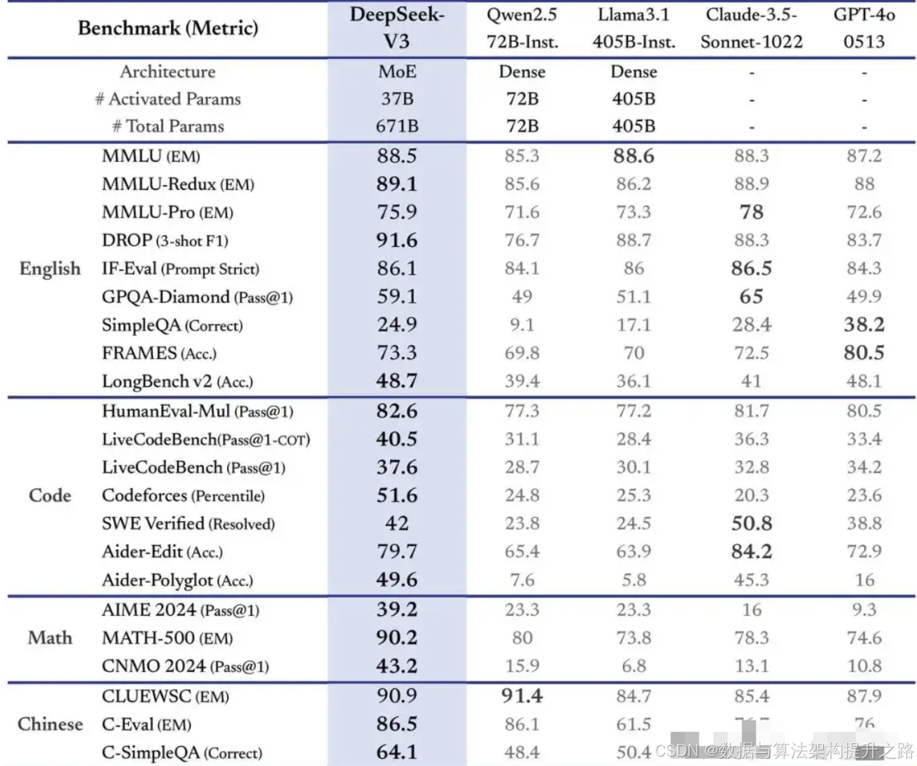 DeepSeek-V3在英语、中文、编程、数学等多个维度进行了全面评估,证明了其作为通用语言模型的能力。它不仅是性能最强的开源模型,也达到了与GPT-4、Claude等顶级闭源模型相当的水平。