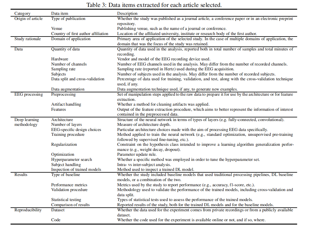 本文选取了 2010 到 2018 年间相关的论文,对于每一篇被选择的文章,大约70个数据项被提取出来,包括 5 个类别:文章的来源,基本原理,使用的数据,脑电图处理方法,深度学习方法和报告的结果;