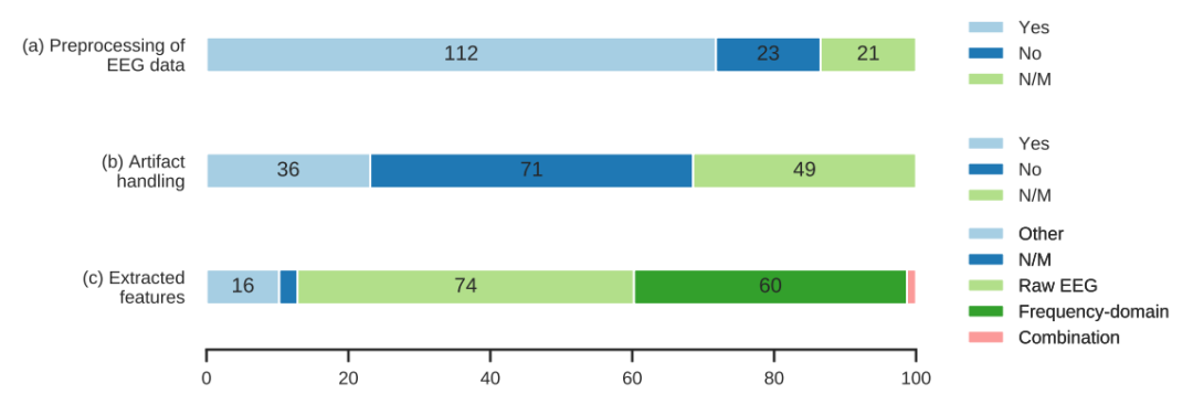 为了研究在使用深度神经网络时去除脑电伪迹的必要性,本文将选取的论文分为三类,特征工程是传统脑电信号处理管道中要求最严格的步骤之一46% 的论文没有使用伪迹处理方法,24% 的论文使用了这种方法,31% 的研究没有提及是否需要人工处理来达到他们的结果;