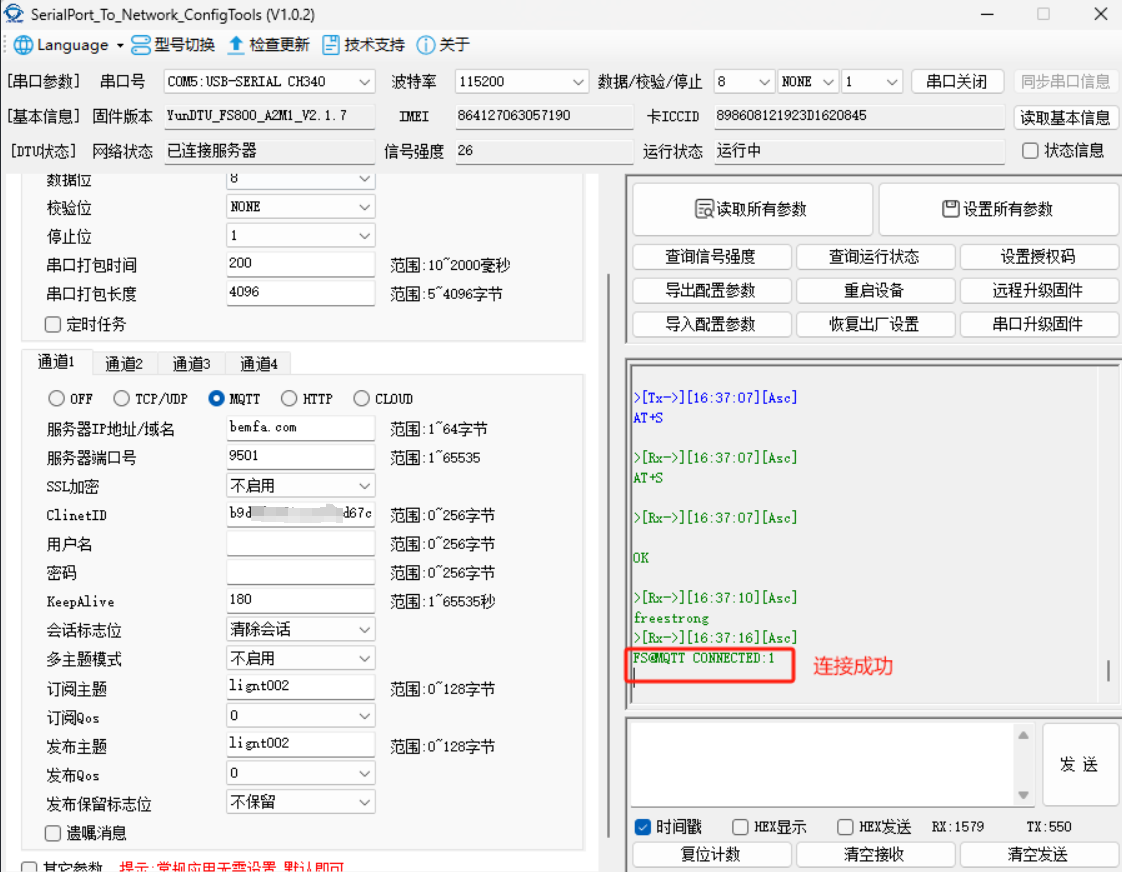 等待设备主动连接巴法云出现FS@MQTT CONNECTED:1表示连接成功,如果出现其他的返回值说明有问题,可以根据资料中的手册找到对应返回值代表的含义,或者联系飞思创工作人员协助解决。