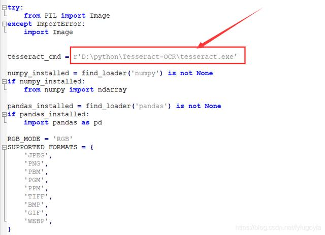 - pytesseract 库的配置:搜索找到pytesseract.py,打开该.py文件,找到 tesseract_cmd,改变它的值为刚才安装 tesseract.exe 的路径。
