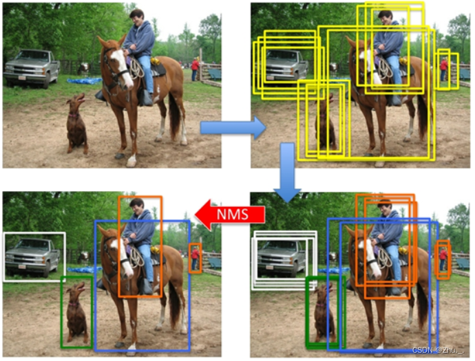 以YOLO的HEAD部分为例,HEAD部分在不同尺度的特征图上分别做检测,然后汇总得到初步的Bouding Box, 最后做非极大值抑制(NMS),筛选合并Bounding Box, 输出最终的结果。