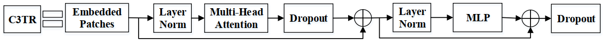 在骨干网络最后一层将原 始 的 BSP ( Bottleneck and CSP ) 替 换 为Transformer[21]结构,利用 Transformer 捕获全局信息和上下文信息并通过其自注意力机制挖掘潜在的图像特征。 Transformer 结构如图 2 中的 C3TR 模块所示,其包含两个子层: multi-head attention layer(多头注意力层)和 MLP(Multilayer Perception,多层感知机)全连接层;子层之间用残差结构连接,外加LayerNorm 和 Dropout 层防止网络过拟合。
