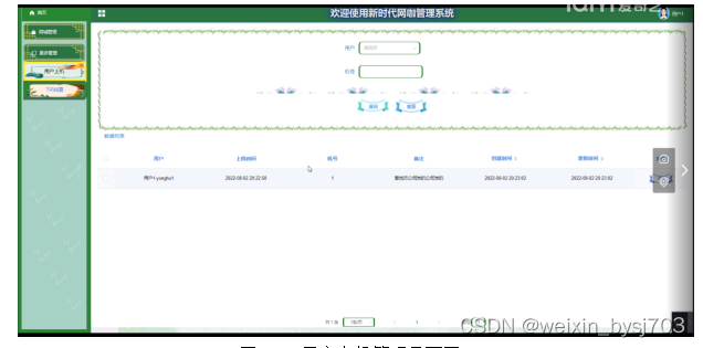 用户上机管理,在用户上机管理页面可以查看索引、用户、上机时间、机号、备注、创建时间、更新时间等内容,并可根据进行详情、查询、重置、等操作,如图5-11所示。