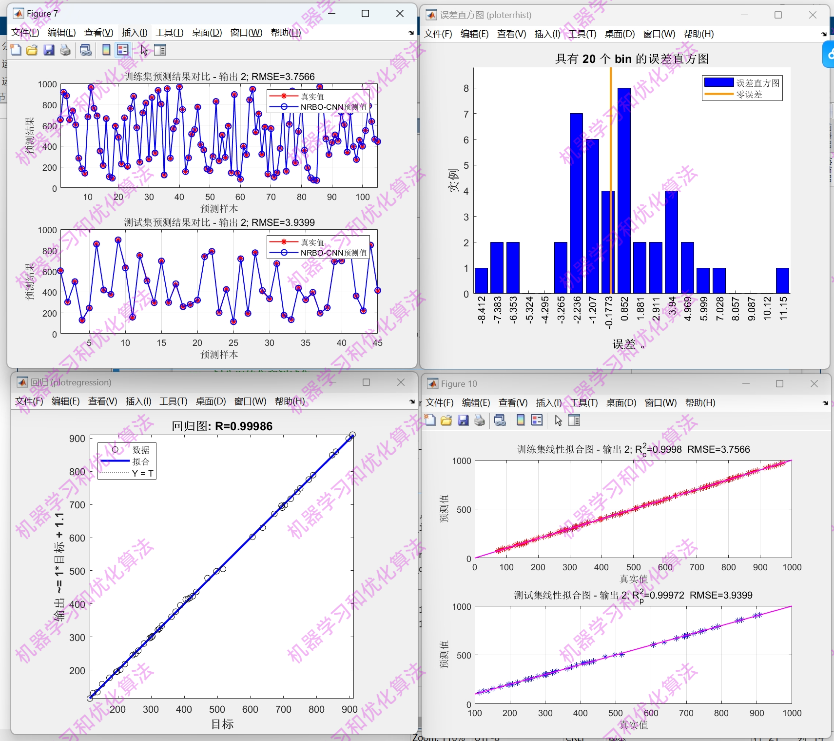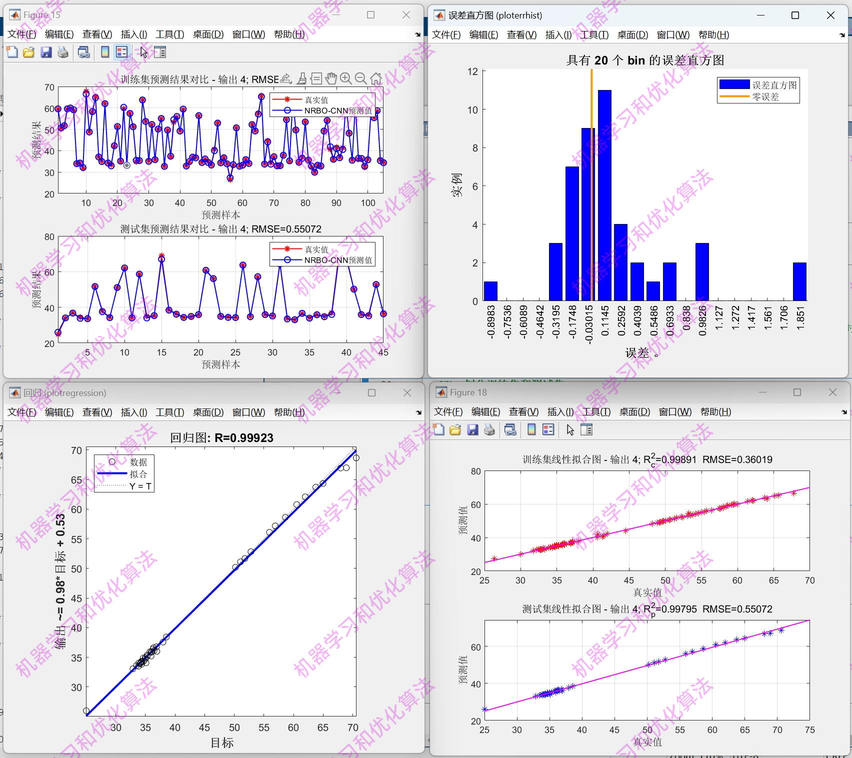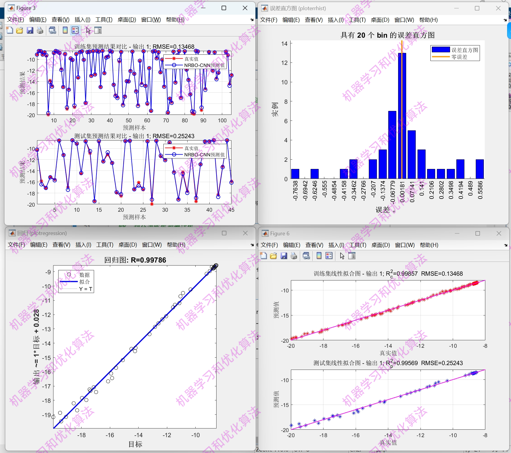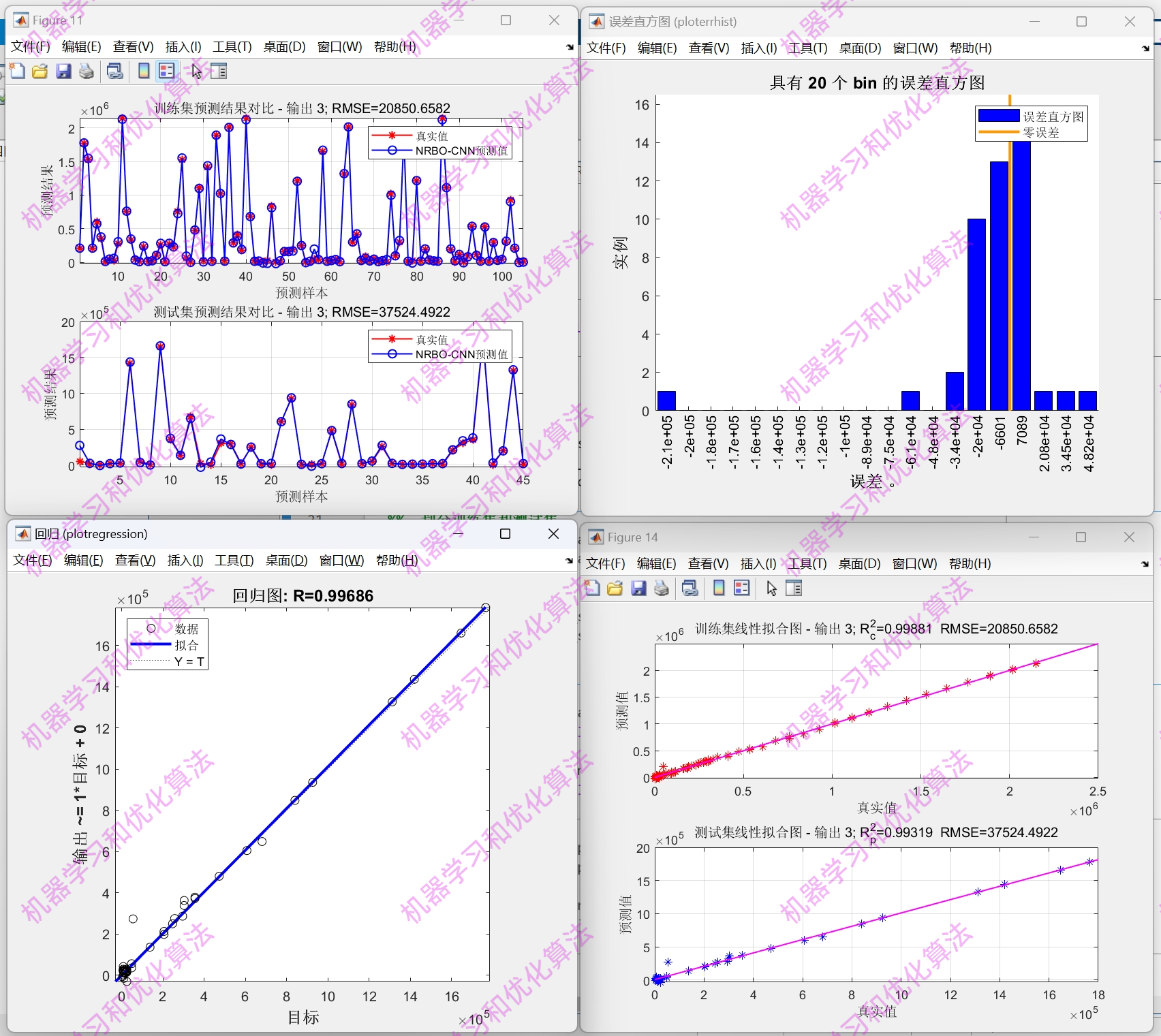以下每个输出都有对应的四张图:预测值和真实值拟合图、误差值直方图、回归拟合图、线性拟合图