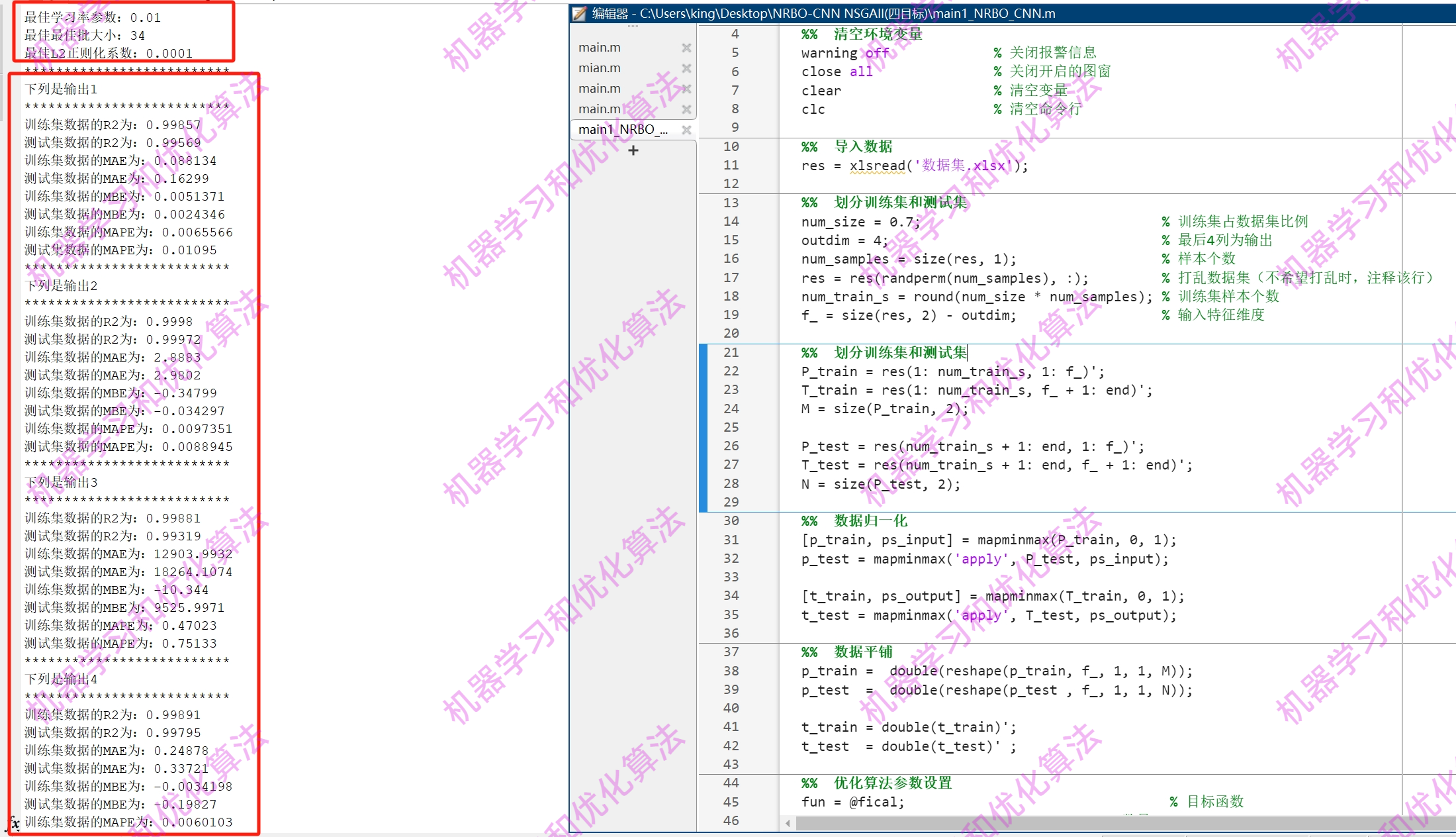 3、代码分别为两个主程序,先运行mian1进行NRBO-CNN多输出回归,再运行main2进行NSGAII多目标算法优化即可。