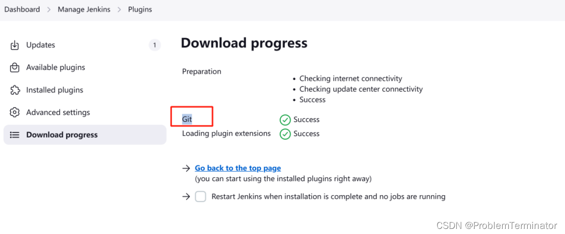 在jenkins主页,左侧点击Manage Jenkins,找到plugins选项,搜索git插件并安装: