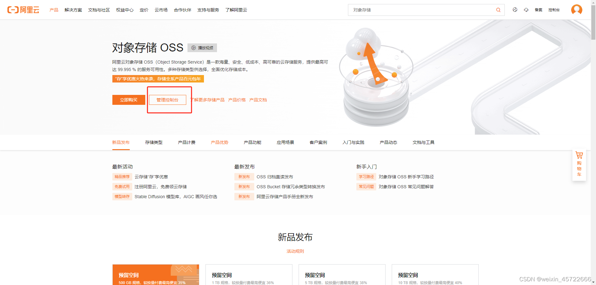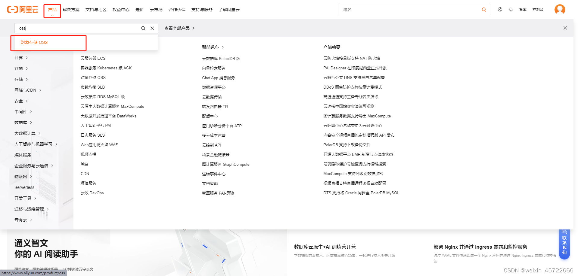 进入阿里云首页后再左上角产品处进行搜索 oss 打开
