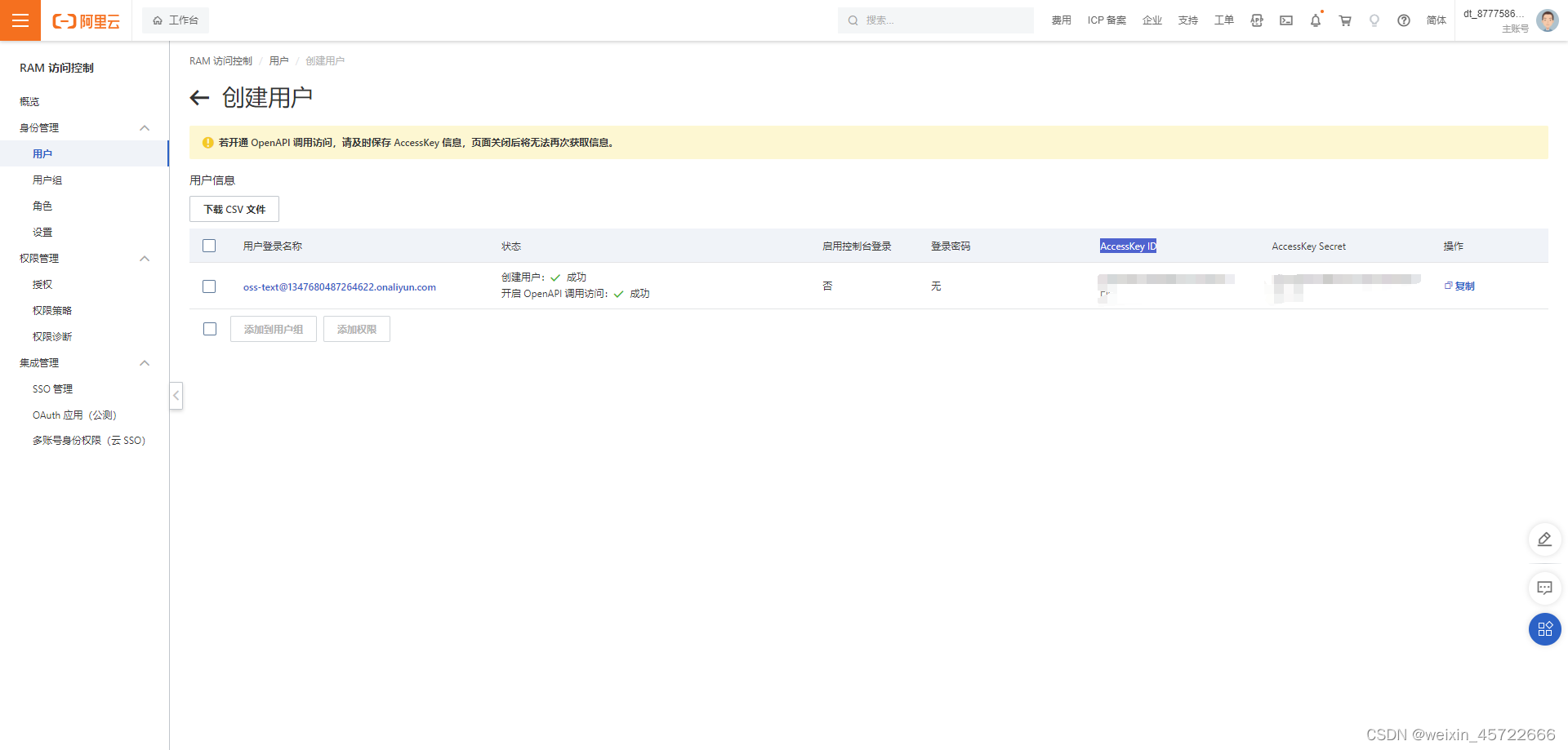 注意:AccessKey ID,AccessKey Secret 务必妥善保管(只有在创建账户时候回显示,后面无法进行查看,自己找地方记住放好)