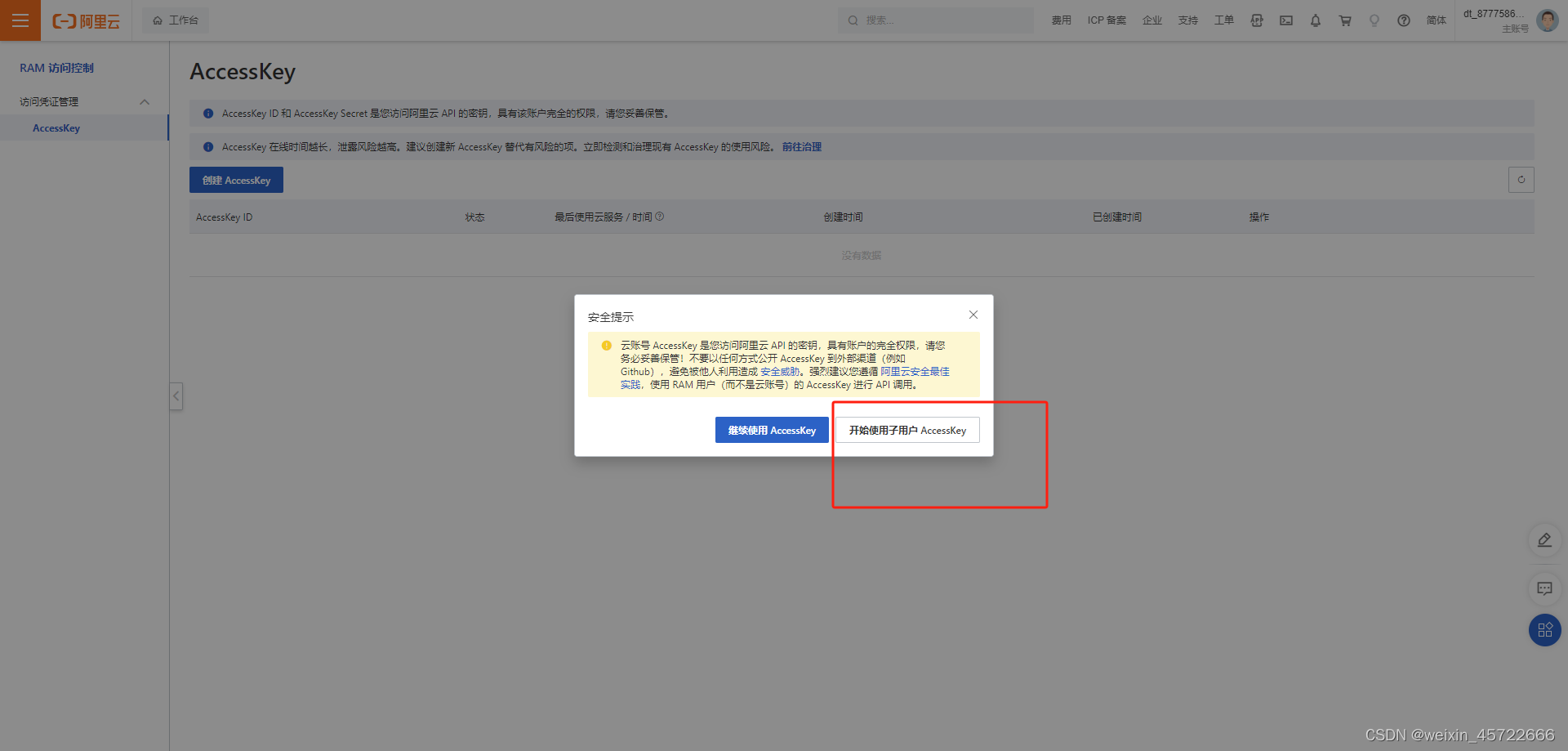 继续使用AccessKey:选择这里使用的是你的当前登录的总账号,如有泄露则其他服务也会一起受影响(不推荐使用)
