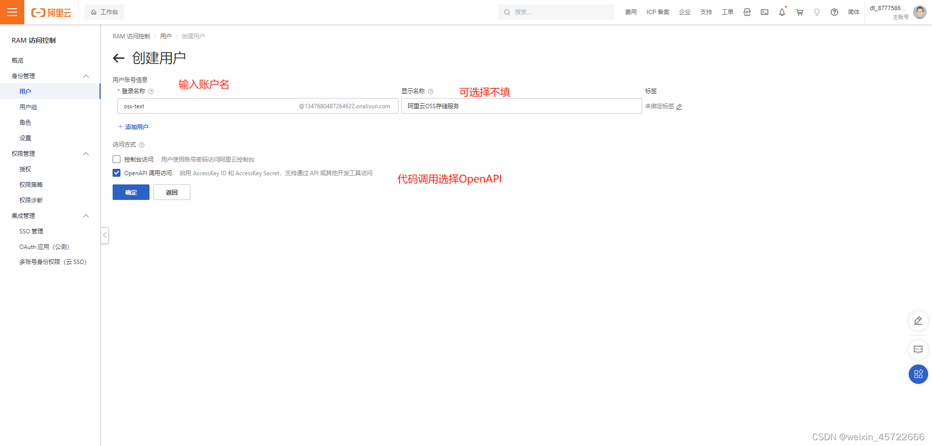 开始使用子账户:创建一个新的子账户,进行授权值针对于OSS存储服务