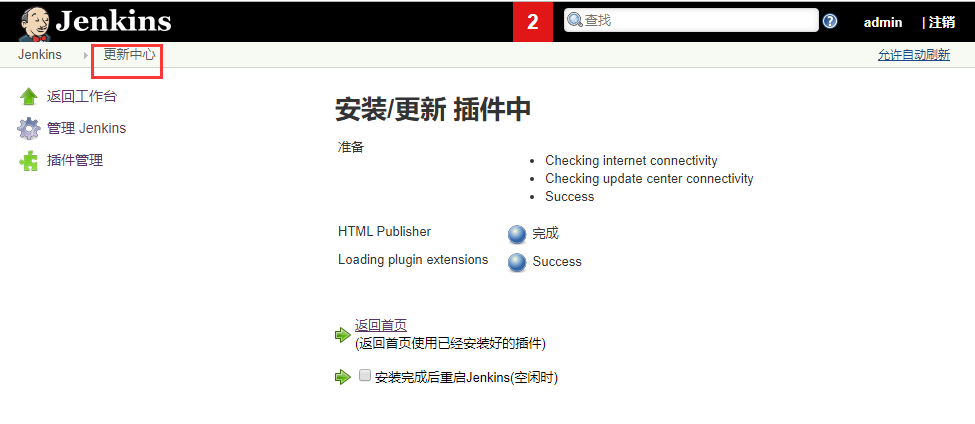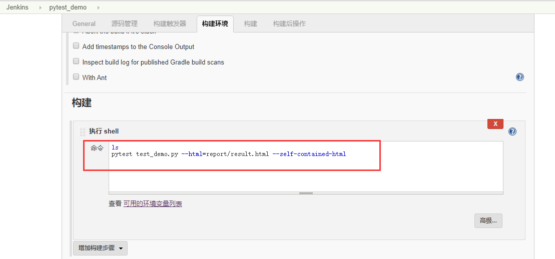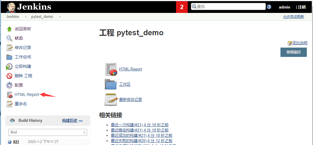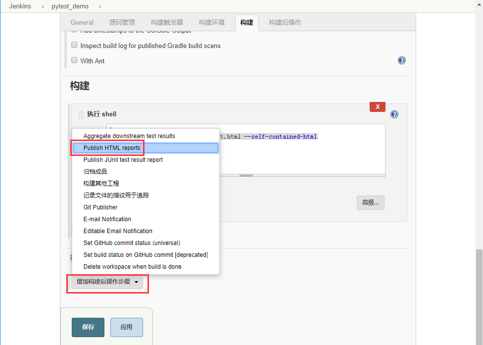 前言pytest脚本运行可以生成html的报告,jenkins上有生成html报告的插件,运行完成后直接在jenkins上显示HTML Publisher系统管理-插件管理-可选插件,搜索:HTML Publisher勾选 HTML Publisher ,点 直接安装更新中心 查看安装完成后回到首页执行 shell执行shell里面配置生成pytest的报告,运行完成后在当前目录下生成一个repo