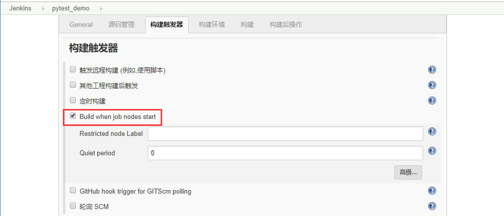 在Job配置页面, 在构建触发器的时候勾选:Build when job nodes start