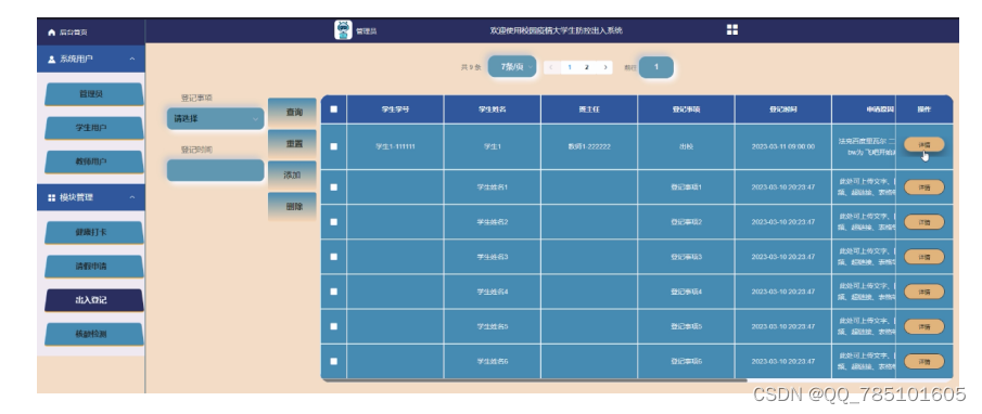 (5)出入登记:点击“出入登记”这个菜单,可以查看到系统中所有添加的出入登记信息,支持通过学生学号或者学生姓名对出入登记信息进行查询,如果想要了解某一出入登记的详细信息,点击后面的“详情”会进入详情界面;