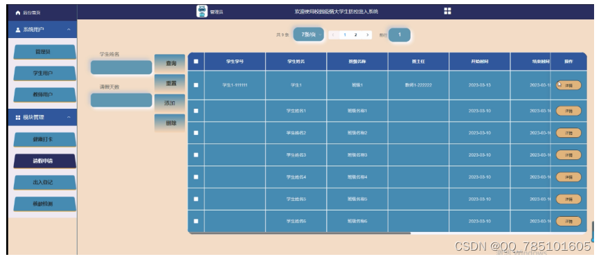 (5)请假申请:点击“请假申请”这个按钮可以查看到所有请假申请信息,支持通过学生姓名或者学生学号或者开始时间进行查询请假信息,可以对请假申请信息进行添加、删除、查看请假信息的详细内容;
