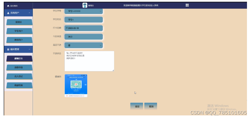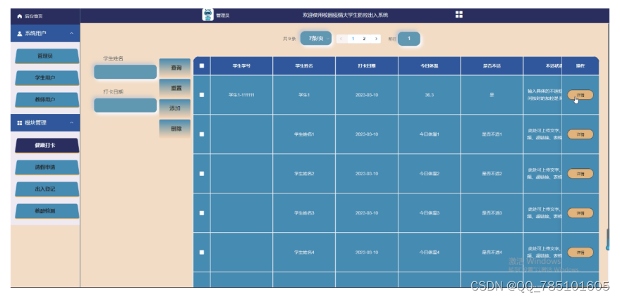 (3)健康打卡:点击“健康打卡”这个按钮可以查看到系统中所有的健康打卡信息,支持通过学生姓名或者学生学号或者打卡日期进行查询健康打卡信息,如果想要添加新的健康打卡信息,点击“添加”按钮然后根据提示输入健康打卡信息,点击“提交”后,在健康打卡界面就会显示新增的健康打卡信息,可以点击某一健康打卡信息查看健康打卡信息的详情,也可以直接点击“删除”进行删除健康打卡;