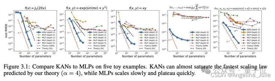 神经缩放规律:KAN 的缩放速度比 MLP 快得多。除了数学上以Kolmogorov-Arnold 表示定理为基础,KAN缩放指数也可以通过经验来实现。