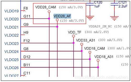 通过核心板原理图可知,VDD28_AF和VDD28_CAM分别对应电源芯片 S5M8767A 的VLDO20和VLDO21。如下图所示:
