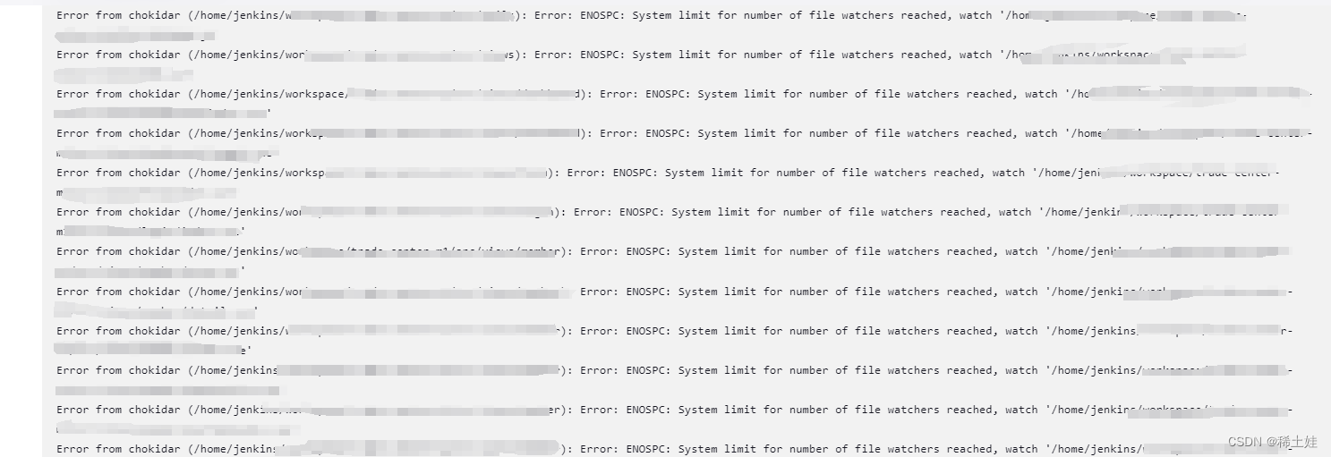 jenkins部署element-admin 好几次了都没问题,最近在测试阶段,页面修改的比较多,所以部署的频率比较大,突然就遇到了这个问题Error: ENOSPC: System limit for number of file watchers reached, watch