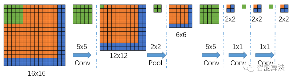 我们可以看到上面的图,输入尺寸由原来的14x14变成了16x16,那么经过一个5x5的卷积(不填充)后,得到一个12x12的特征图,然后再经过一个2x2的池化后,尺寸缩小到一半变成6x6的特征图,再经过一个5x5的卷积后,特征图变为2x2,接着后面再进行两次1x1的卷积(类似全连接操作),最终得到一个2x2的输出结果,那么该2x2的输出结果,就代表最前面16x16图像区域的分1类情况,然而,输出是2x2,怎么跟前面对应呢?