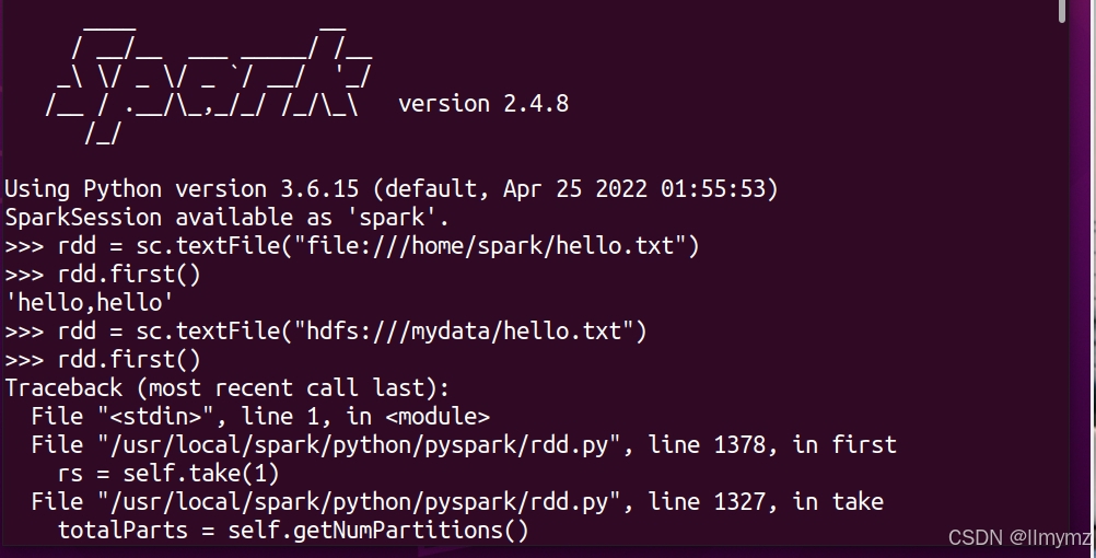 从 PySparkShell 启动输出的提示信息可以看出,Spark2.4.8 使用的是 Python3.6,这也再次证明之前的配置是正确的。