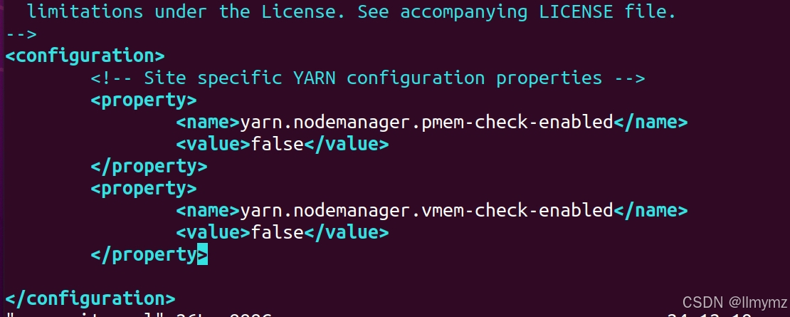 2)打开 yarn-site.xml 文件,在其中增加与内存检查相关的设置。因为虚拟机使用的