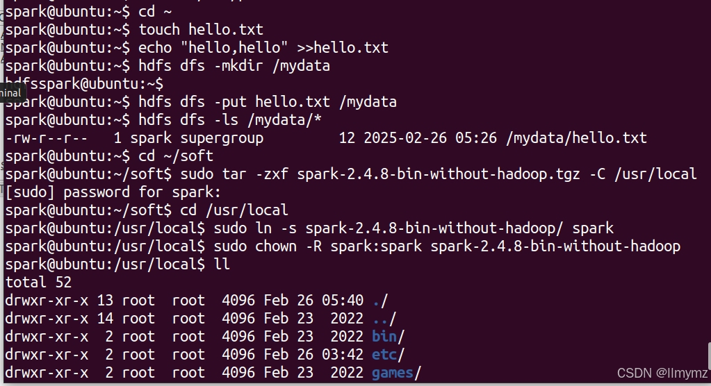 1)打开一个 Linux 终端,在其中执行以下命令将 Spark 软件包解压到/usr/local 目录