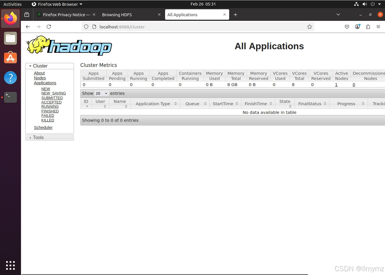5)在 Ubuntu20.04 浏览器中访问 http://localhost:8088,查看 YARN 的 WebUI 管理页面,如图 1-39 所示。如果是在 Windows 的浏览器访问,则需要将网址中的 localhost 改成Ubuntu20.04 虚拟机的 IP 地址才行。