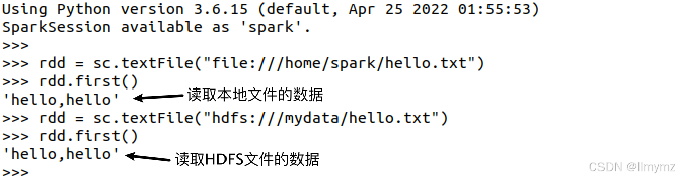 里假定 HDFS 已正常运行。请在 PySparkShell 中输入以下代码执行