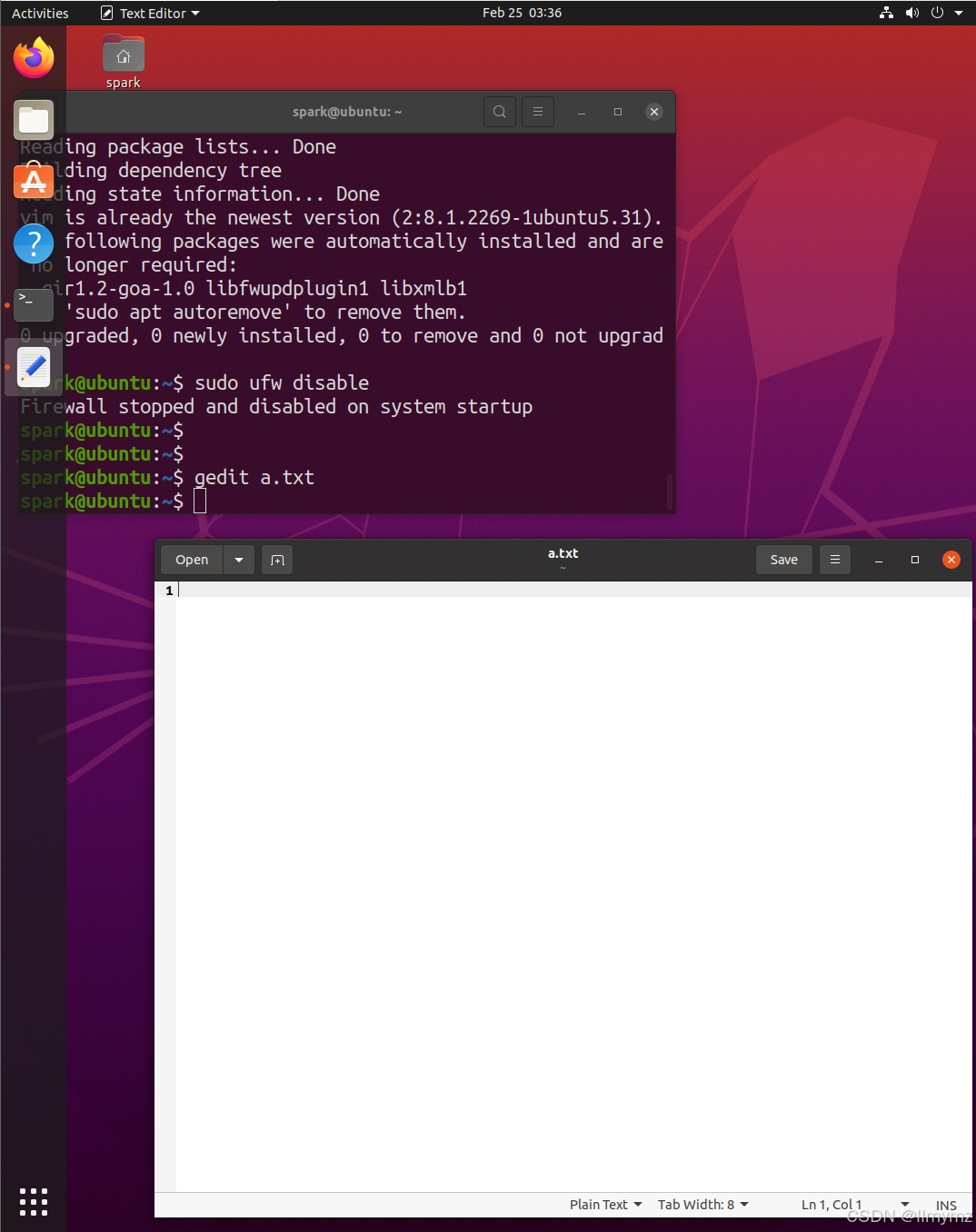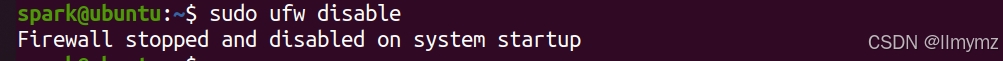 4)输入下面的命令,将 Ubuntu20.04 自带的防火墙禁用掉,避免在远程终端连接时出现问题,包括运行 Hadoop 和 Spark 时也要禁用防火墙。
