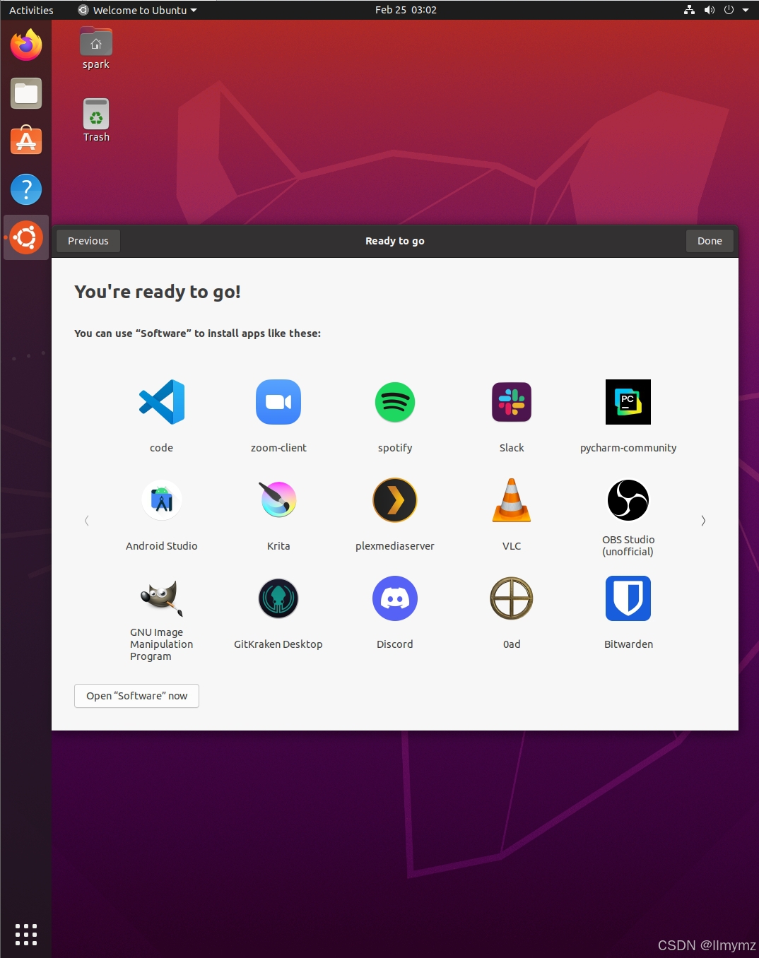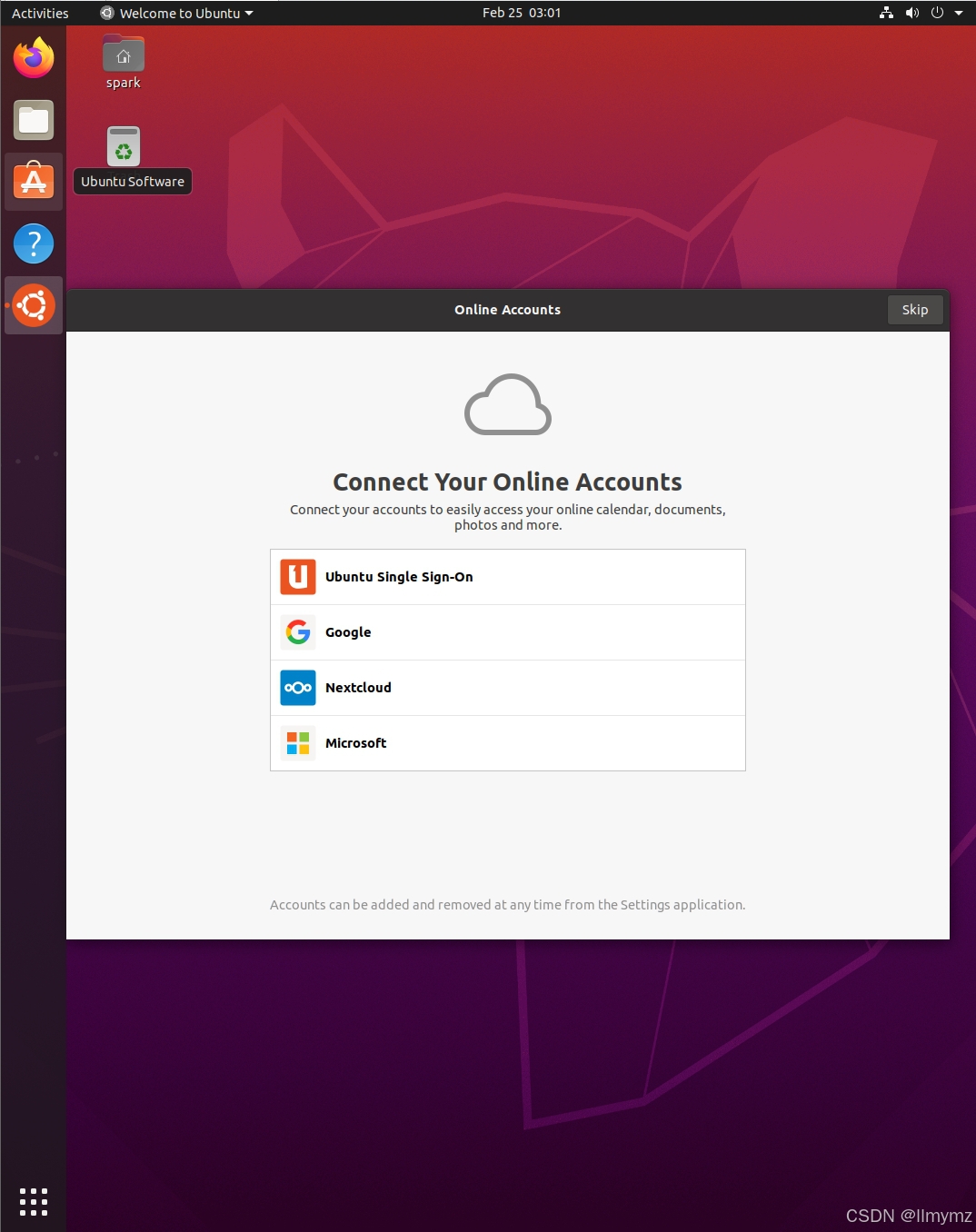 11)Ubuntu20.04 操作系统的初始界面如图所示,第一次启动时会相继提示几个信息的设置,包括网络在线帐号设置、更新设置、问题提交、隐私设置等,直接点击右上角的“Skip”和“Next”,直至最后一个窗体点击“Done”全部完成。