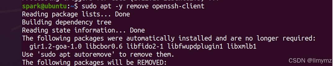 2)输入下面的命令安装 openssh-server。为避免版本冲突这里先卸载 openssh-client,在安装