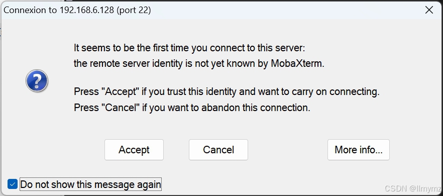 首次连接到远程服务器时,MobaXterm 还会显示一个确认窗体。在这个窗体中,勾选“Do