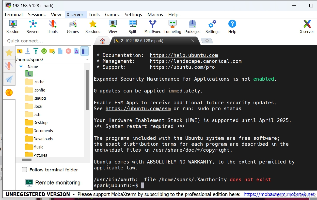 MobaXterm 成功连接远程服务器后的界面,如图所示。在这里,可以像 Linux 系统本地