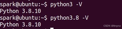 从输出的文件列表可以看出,python3 实际是一个软链接文件,指向 python3.8 执行程序。我们可以分别运行 python3 和 python3.8 命令,以确认它们是否为同一个: