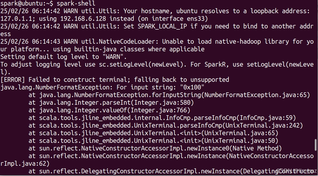 1)打开 Linux 终端窗体,输入 spark-shell 命令启动 SparkShell 交互式编程环境。启
