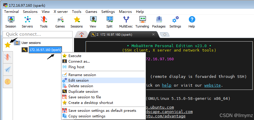 此外,MobaXterm 还会将连接过的服务器信息保存在收藏栏中,双击保存的连接信息即可自动连接,或者在保存的连接信息上点击鼠标右键,选择弹出菜单中的 Edit session(编辑)、Delete session(删除)等还可以对连接信息进行管理。