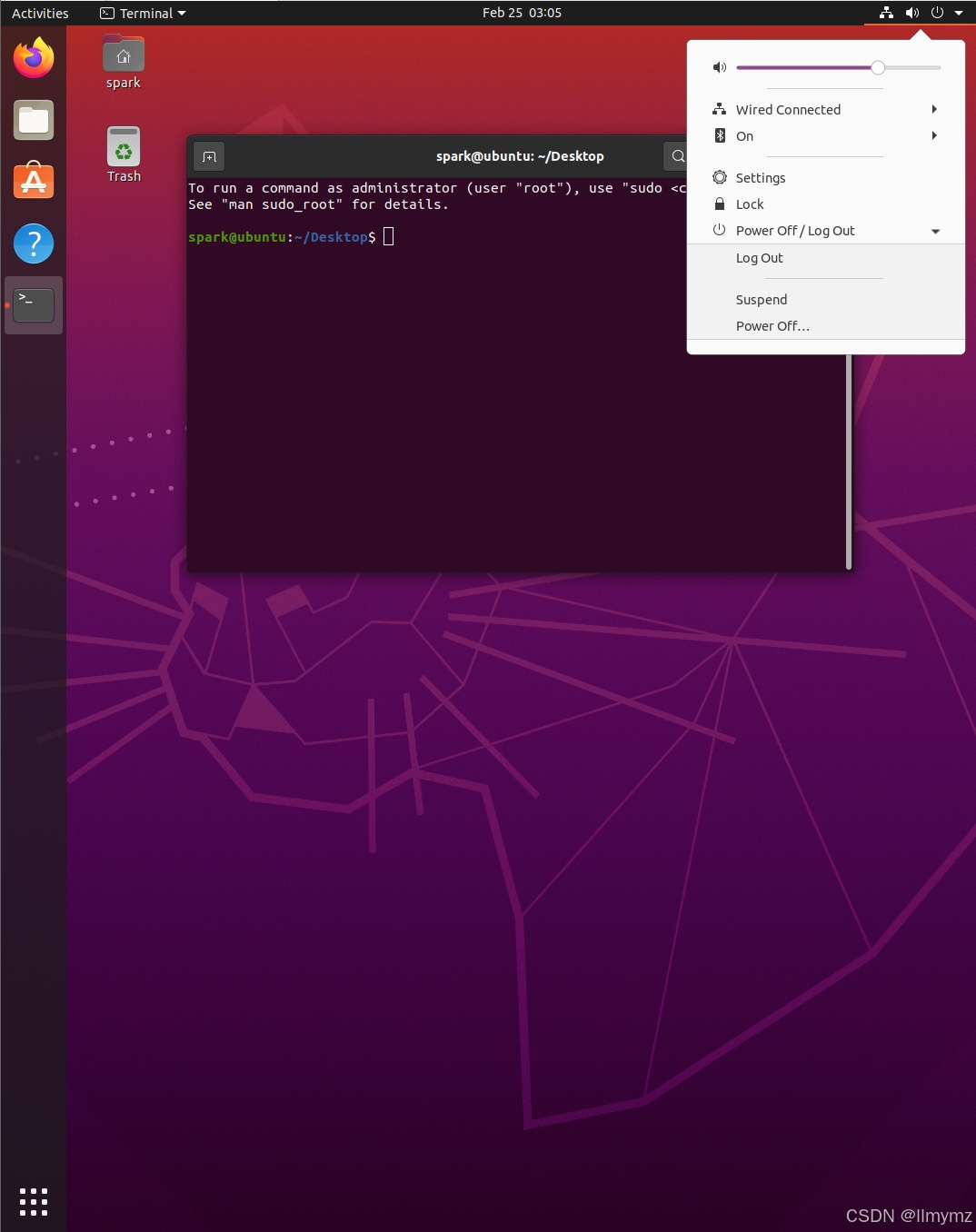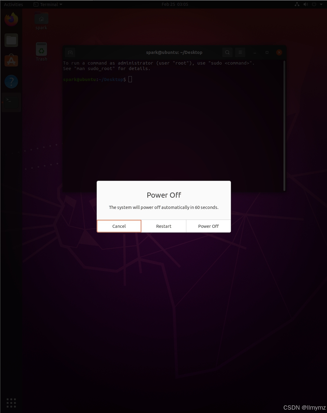 16)点击 Ubuntu20.04 桌面右上角的电源图标,选择“Power Off/Log Out”下面的“Power Off”菜